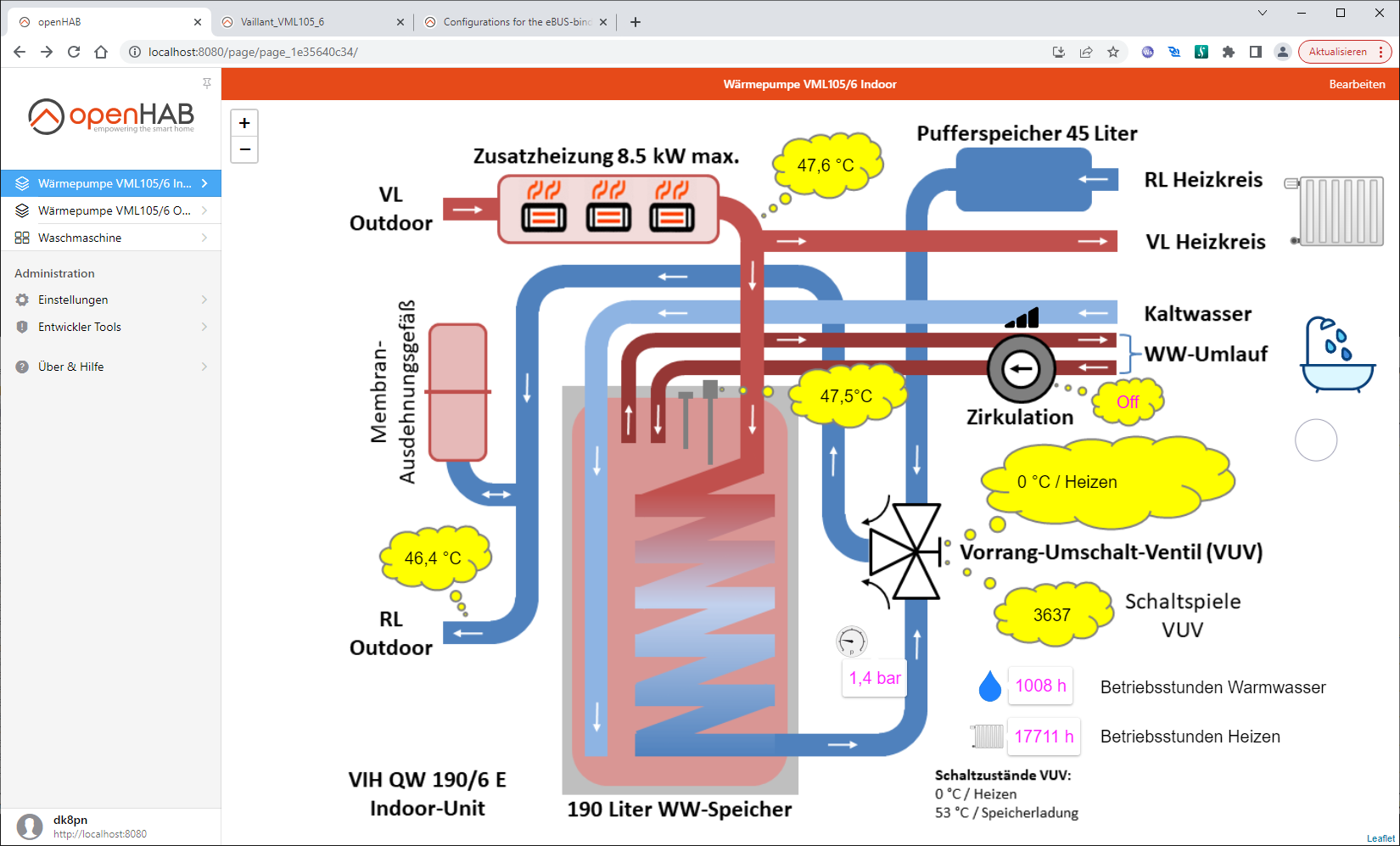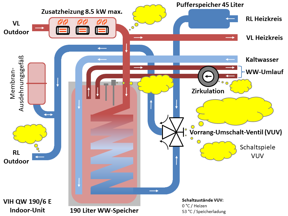 Exchanged the indoor unit functional diagram/picture within the post above. The circulation pump location has been initially wrong. It is sitting in the circulation return pipe with a pump flow direction towards the hot water storage. Exchanged the indoor unit YAML file accordingly.
