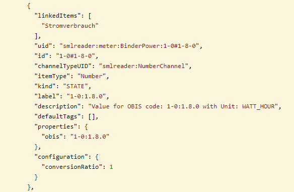 Everything works fine - except the value of channel="smlreader:meter:BinderPower:1-0#1-8-0", is 1000times higher than the exact value. For this @msteigenberger added an attribute “conversionRatio” to the channel, which can be set via PaperUI: