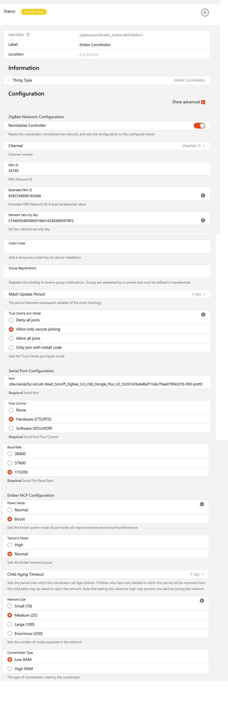 2025-02-09 19:32:29.393 [DEBUG] [ng.zigbee.ember.handler.EmberHandler] - ZigBee Ember Coordinator opening Port:'/dev/serial/by-id/usb-Itead_Sonoff_Zigbee_3.0_USB_Dongle_Plus_V2_52cb7a1ba64bef11abc7baa079f42d1b-if00-port0' PAN:87b4, EPAN:B3BCF66B9E1B3048, Channel:11