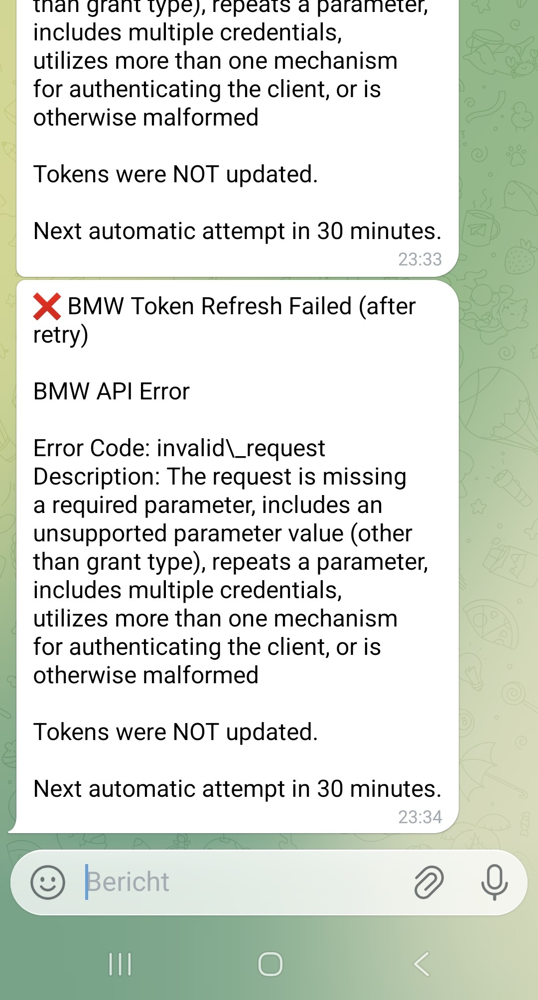 I still get the following errors. The token setup works fine via the Cardata Customer portal (not via Telegram or log file), but the updating is not working for me: