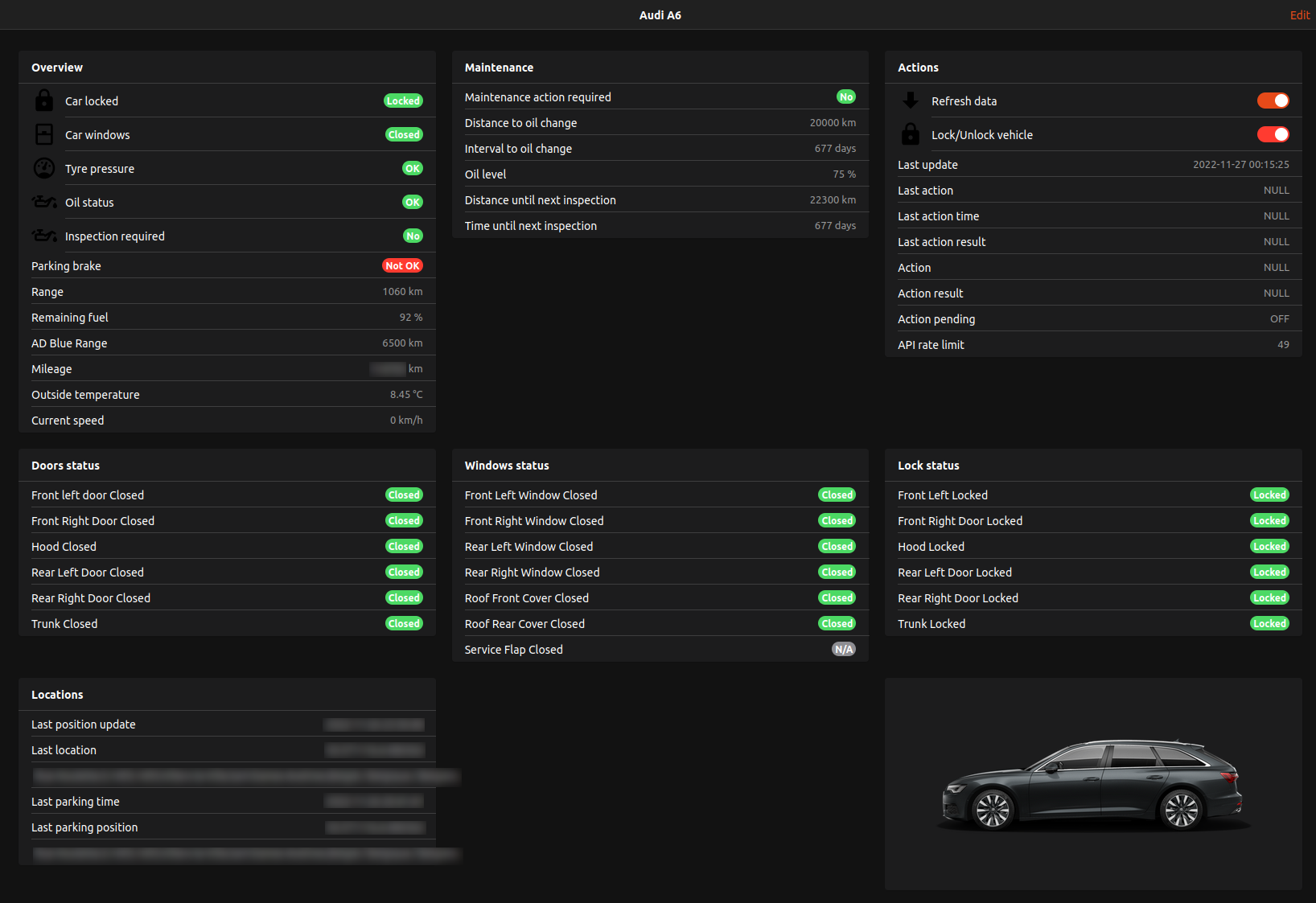 In case anyone is interested, I created a dashboard for my Audi A6: Openhab connected car dashboard · GitHub