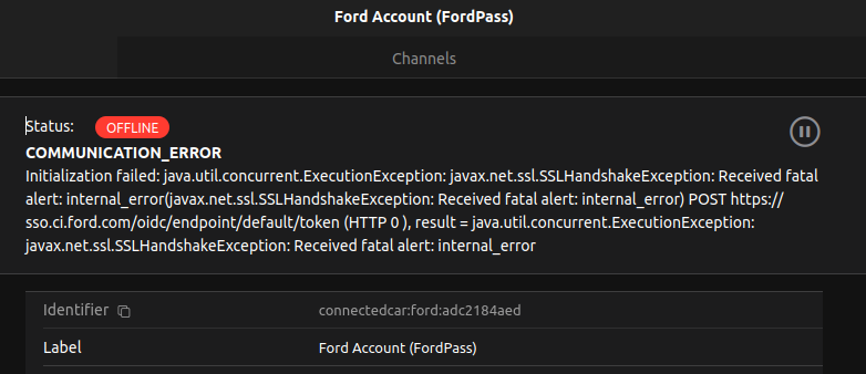 2024-03-31 10:25:55.484 [INFO ] [ab.event.ThingStatusInfoChangedEvent] - Thing âconnectedcar:cnvehicle:e9ae5cb5e1:WAUZZZâŠâ changed from OFFLINE (COMMUNICATION_ERROR): API Service not accessible or disabled to ONLINE
