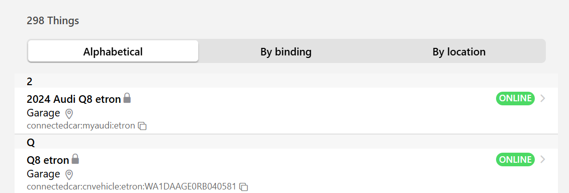 2024-03-31 10:25:41.058 [INFO ] [ab.event.ThingStatusInfoChangedEvent] - Thing âconnectedcar:myaudi:e9ae5cb5e1â changed from UNKNOWN to ONLINE