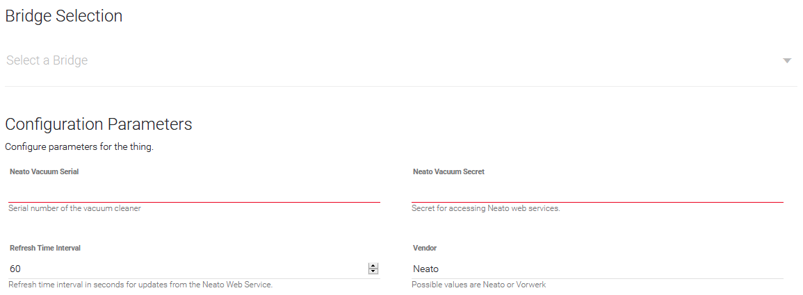 Normally you would create a Bridge first, enter your credentials and a proper vendor and save it. After that you can go to your inbox and discover your vacuum automatically.