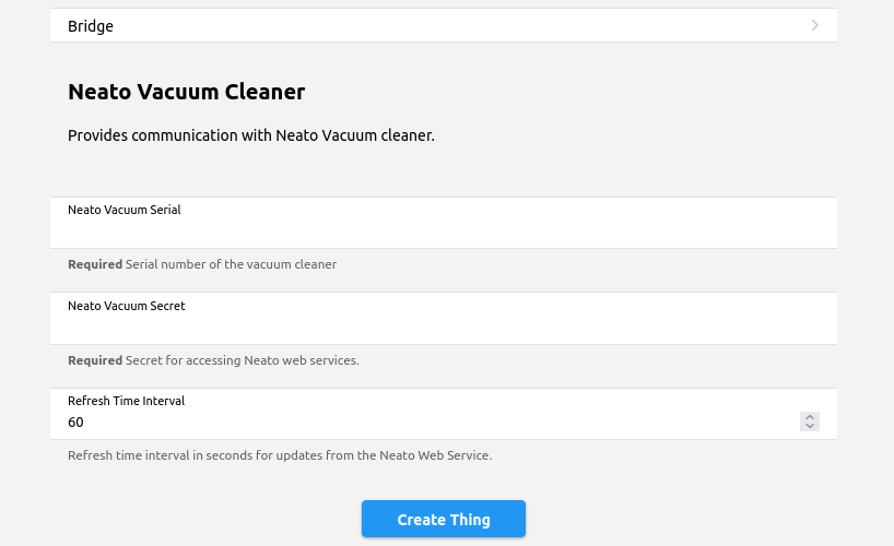 As yesterday reported, my fork still works for Vorwerk (official Neato Binding never supported it). You only need your serial and secret obtained with my script above. You don’t need to create a bridge, just use both values with proper vendor vorwerk to create your Vacuum Thing.