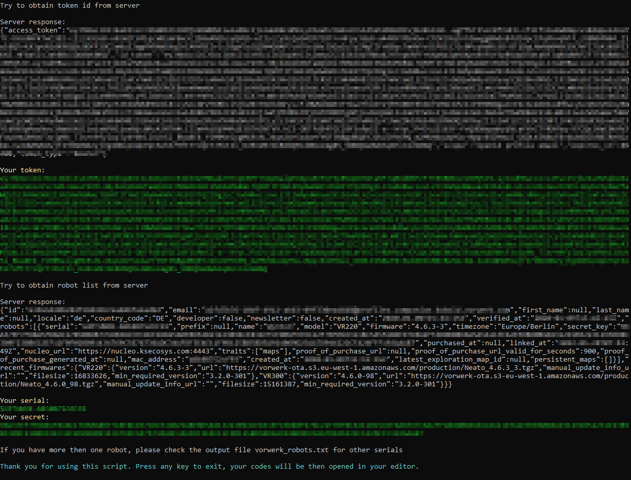 Then run the *.bat file and enter your email address from the Vorwerk account. You will then receive an email with a code and enter it there: Then you will have everything you need: