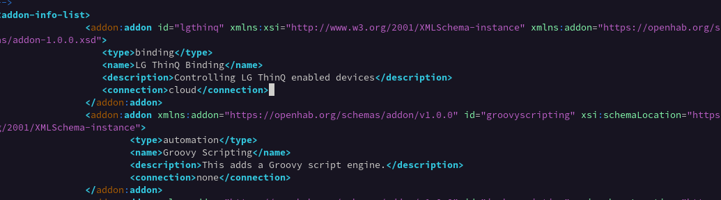 Well, all this to say if you add this (<addon:addon id=“lgthinq” … </addon:addon>) at the beginning of the openhab-sys/runtime/etc/addons.xml file:
