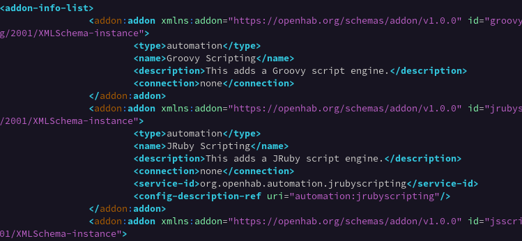 - Verify the addons.xml file (/usr/share/openhab/runtime/etc/addons.xml) → can confirm the first node was “Groovy Scription”