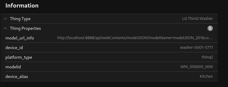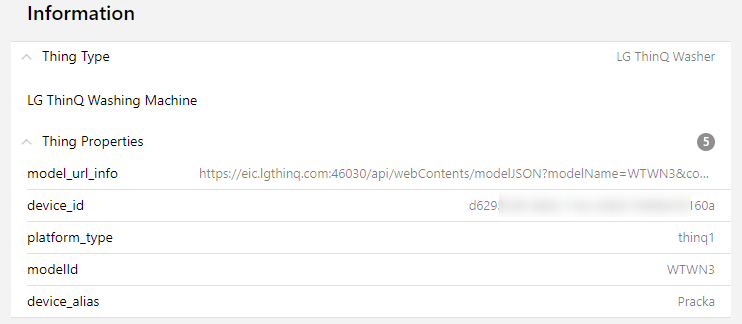 I’m looking for someone that has Thinq V1 Washer. But, from the model I can’t know if it’s V1 or V2. You have to install my binding, registry your device and in the configuration of the Thing, you can see the properties information. Something like this: