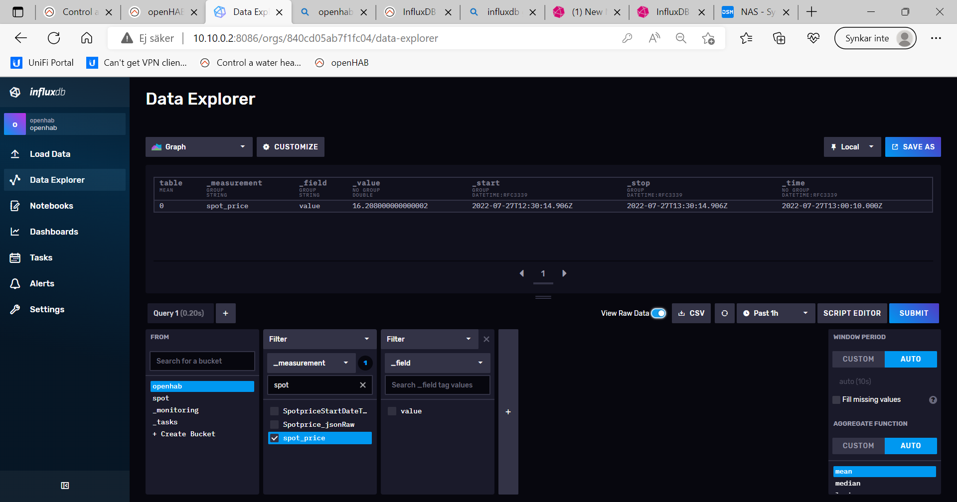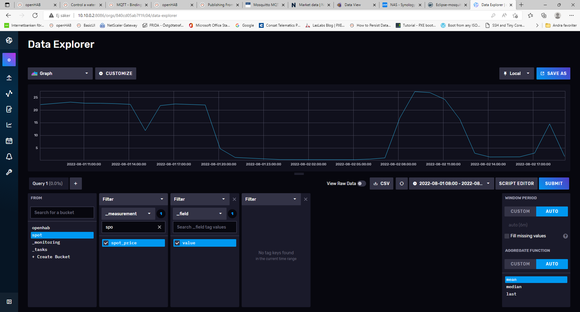 The reason why you’re not seeing more than one value is that your Influx Query is searching for data for “past 1 hour”. Change the range to include tomorrow and you’ll see tomorrow’s spot prices