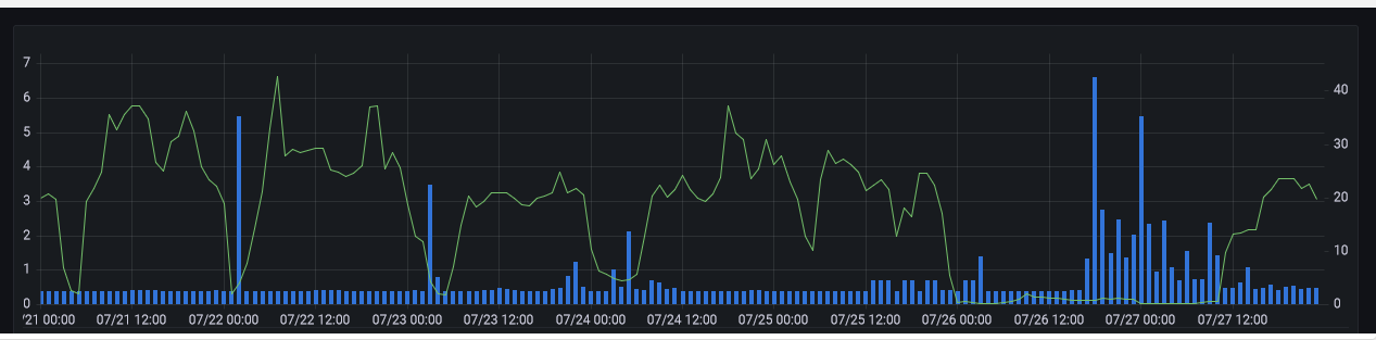 Here’s what I’ve been able to achieve so far. Blue bars is my consumption which I’m able to fetch from the power grid operator and green line are the spot prices. You can see nice consumption peaks when the prices are lowest.