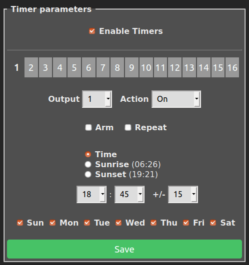 Below is an example where Timer 1 is set to turn Output 1 of the device (on a Sonoff Basic this is the relay) to On at 1845hrs +/-15 minutes, every day of the week.