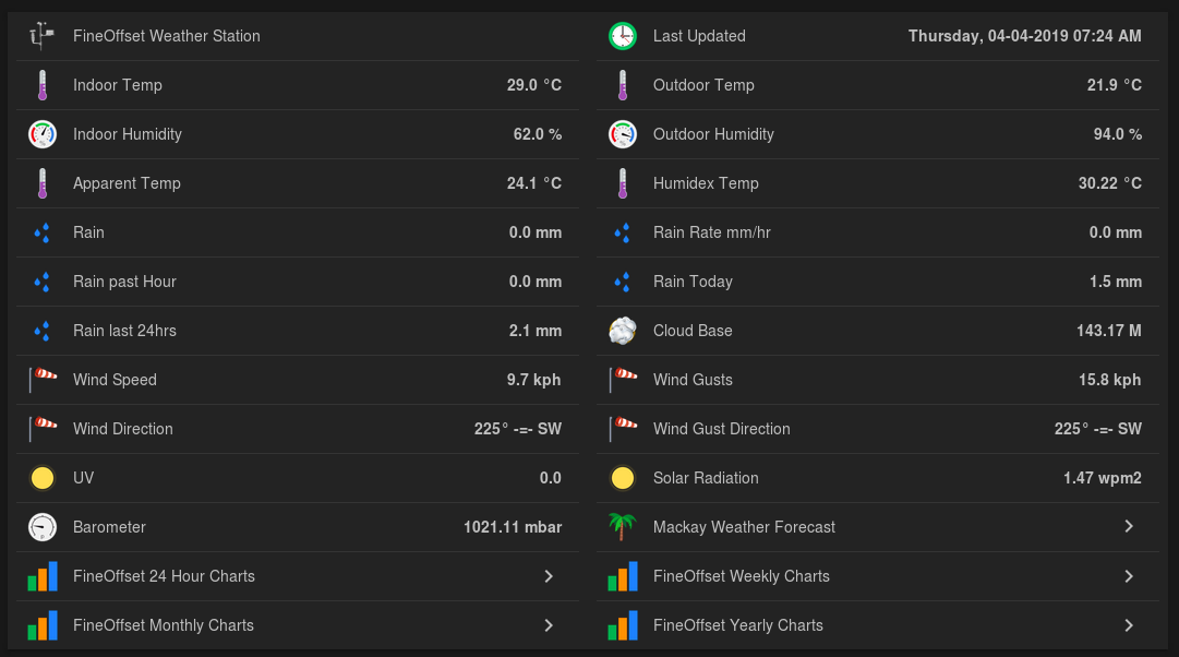 I have a FineOffset WH3081 weather station which I monitor with ‘weewx’ on a Linux Mint PC. There’s an extension for weewx that adds MQTT functionality and I’ve used this to also display info on an OpenHAB2 page. Written by Matthew Wall and available HERE.