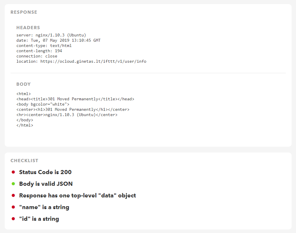 I think I have your culprit : The request URL you’re setup is in http and your server redirect http to https then the body response is “Moved” in this case.
