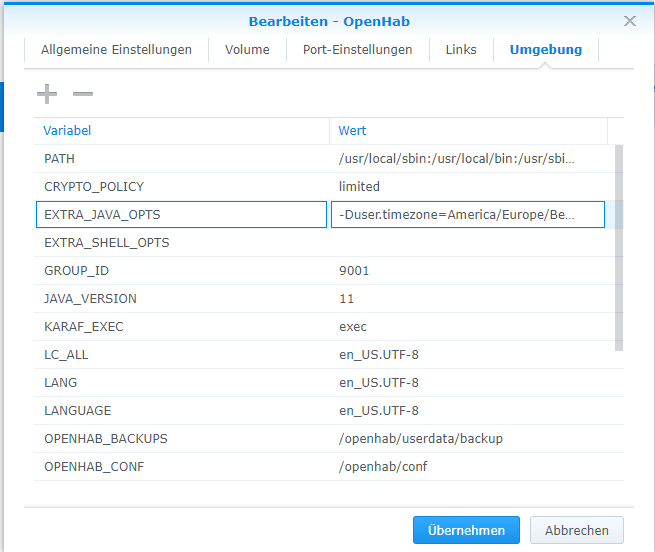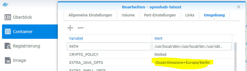 For the general problem. Maybe someone can add these setting of the timezone locale to the standard openhab docker container? On my last install the setting was just empty by default.