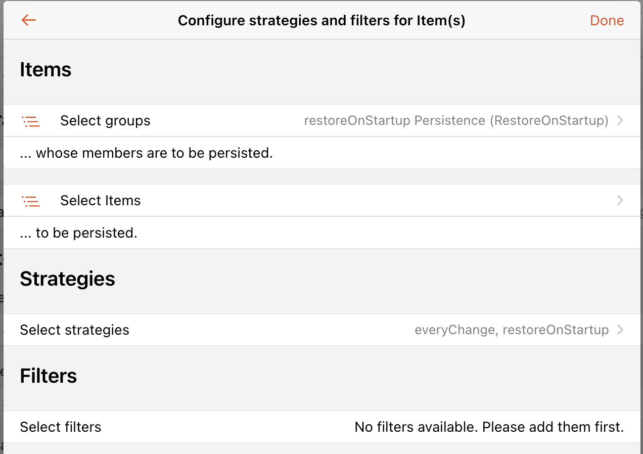 By default, a persistence add-on will implement a default strategy which will usually be something like āall Items on every change with restoreOnStartupā. This may be just fine for most use cases. However, many times one may not want to save all Items to a given database, or they may want to apply filters that apply to some Items, or have some Items save to one database and other Items saved to a different one.