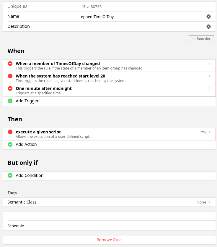 I have imported ephemTimeOfDay.yml as the rule, and if i manually run it the ‘TimeOfDay’ changes correctly. How can i make ephemTimeOfDay rule run all the time.