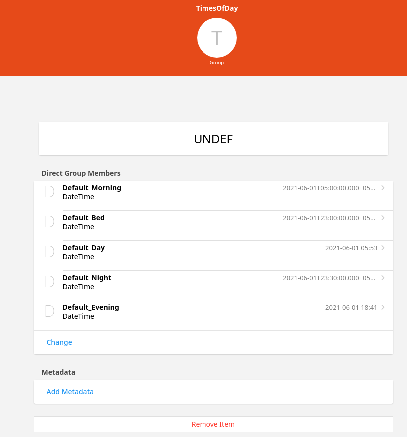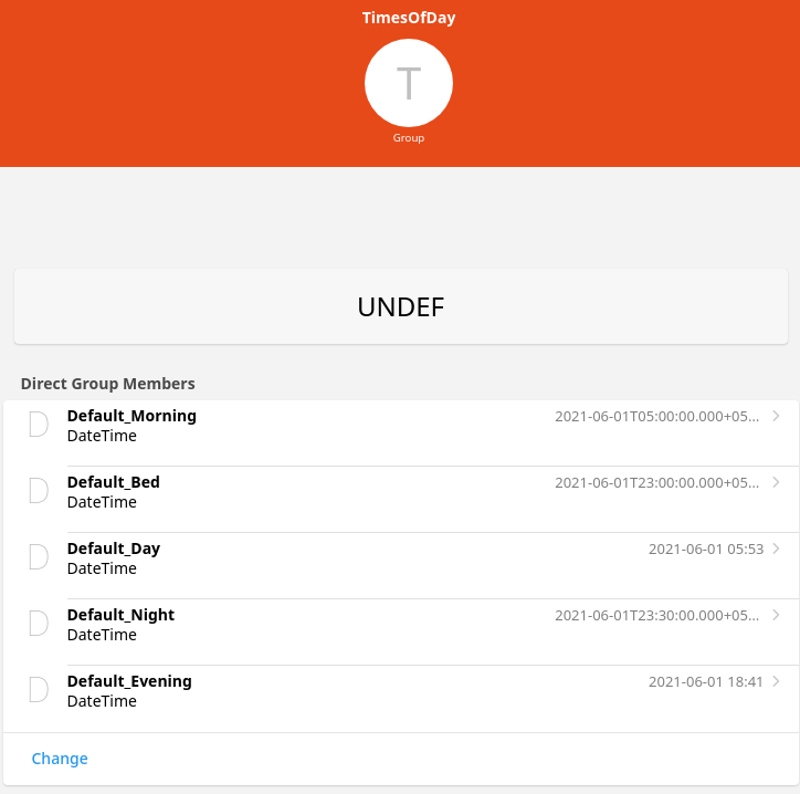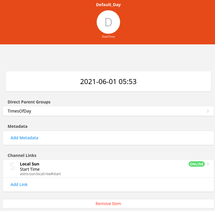 Item Default_Day should start when astro:sun:home:rise#start event is triggered. When I am in the ‘Items view’ it has a value of 2021-05-25T05:35:00.000+02:00 (sunrise is at 05:35 local today).