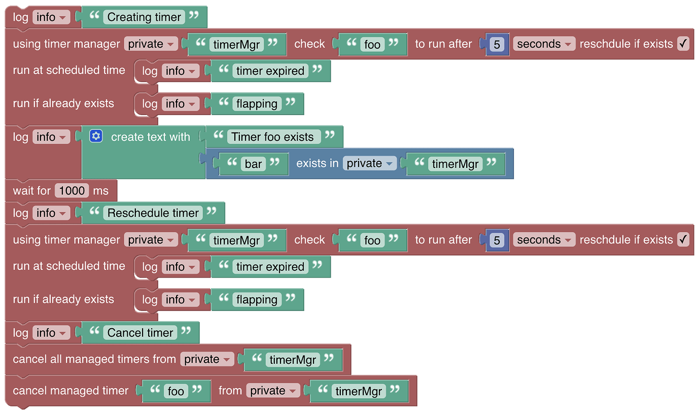 See the docs for the library for more details. The block creates a TimerMgr in the given cache with the given name. It checks to see if a timer by the name “foo” already exists. If “reschedule if exists” is checked it will reschedule it and any blocks next to “run if already exists” are run. If the timer doesn’t exist, the blocks next to “run at scheduled time” will be run after the given “after”.