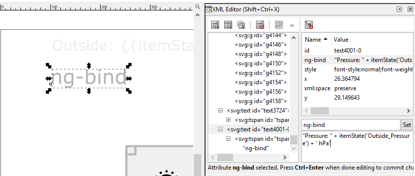 You can keep working on the SVG and the CSS file in conf/html, and simply reload the HABPanel page to pick up the changes! There are a lot of things in the CSS and SVG specs to render animations, color gradients, glow effects and shadows etc. For instance, take a look at the Filter menu in Inkscape. It will define filters and reference them in the style attribute. You can then use for example ng-style to add or remove a filter depending on a condition. Inkscape allows importing PDFs or images and embedding them in the SVG too.