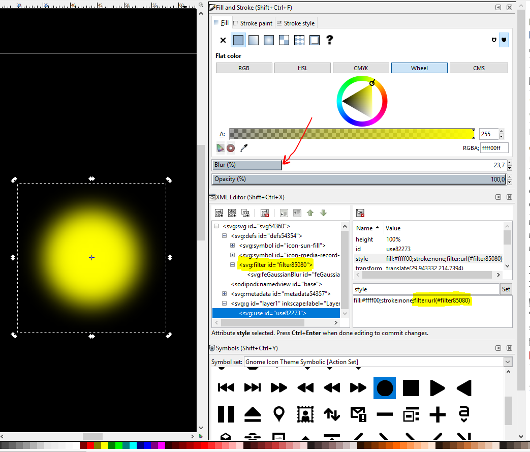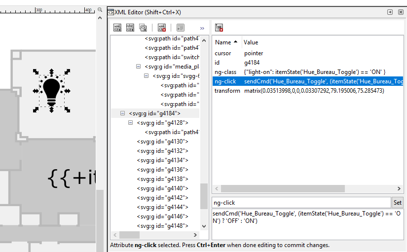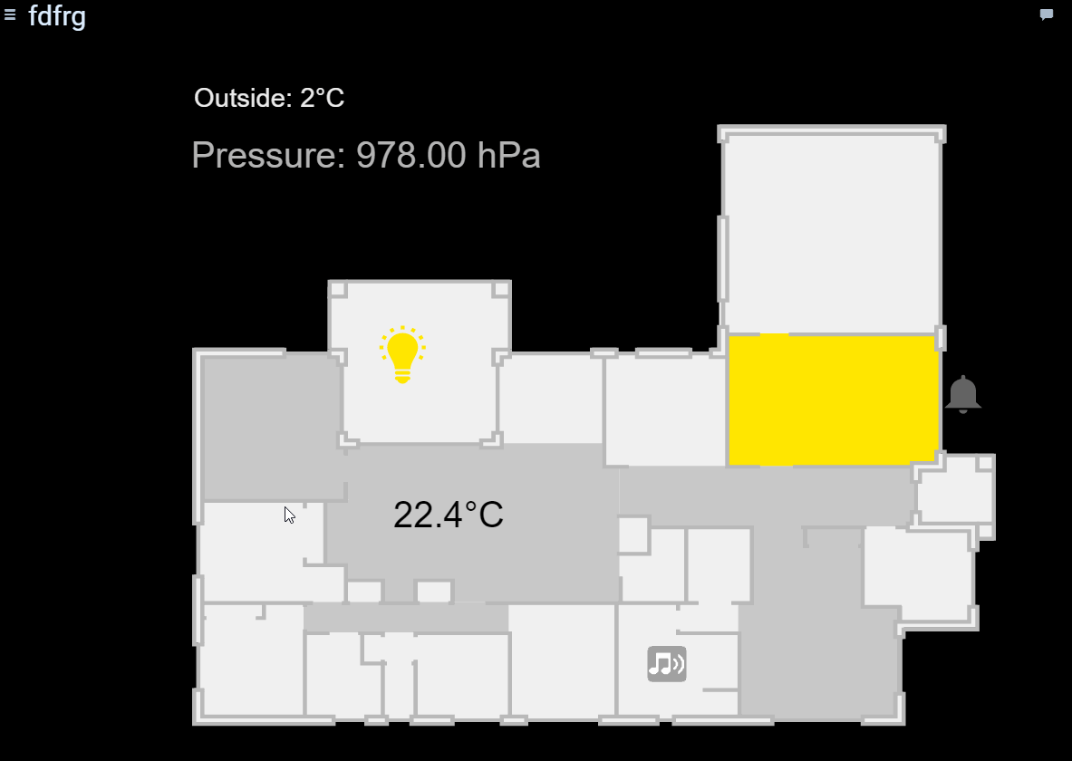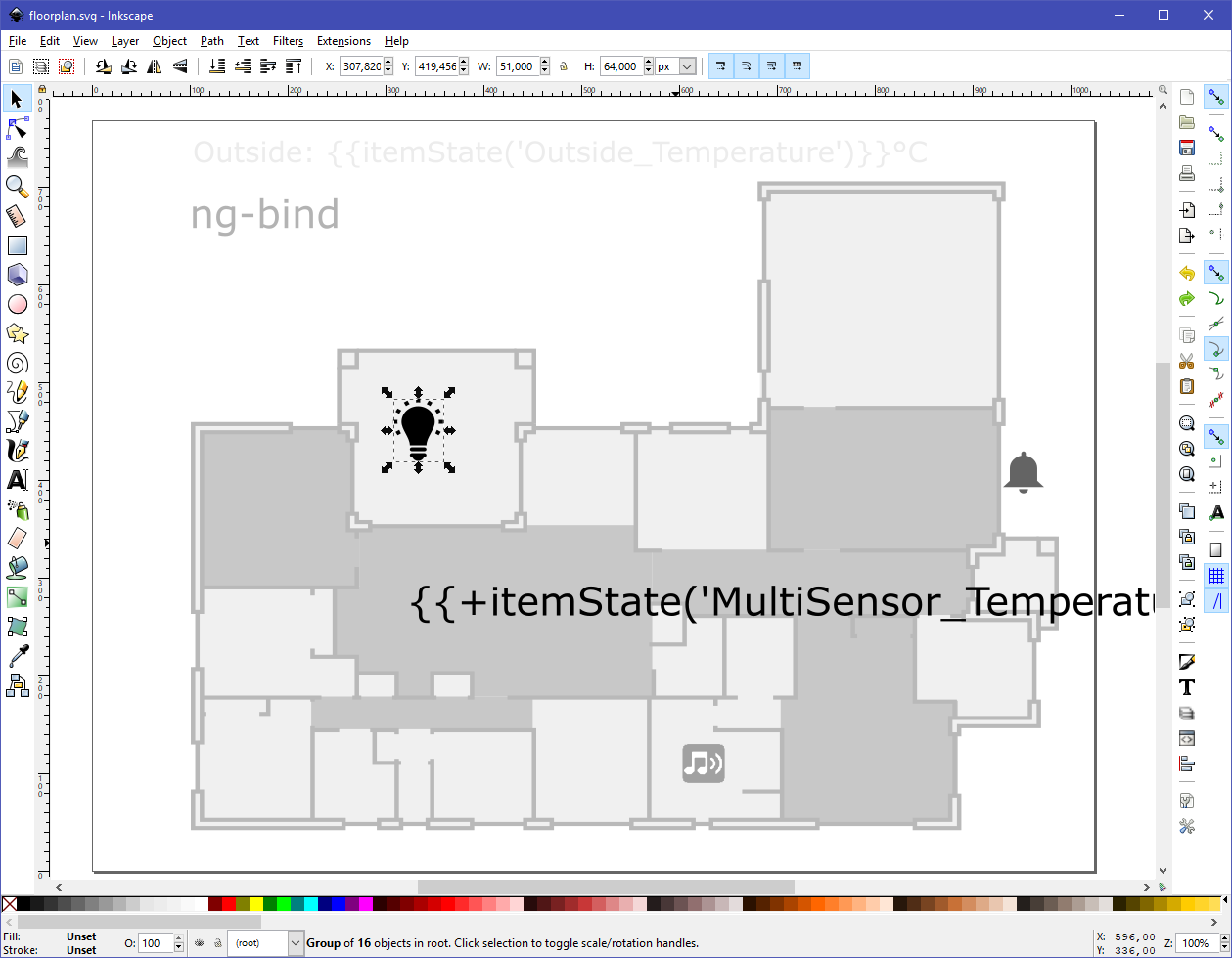 Finally, create a CSS file and put in conf/html/floorplan.css with the content below - you can do lots of complex things, but this will simply define the CSS class light-on with a yellowish fill color (!important is here to override whatever fill color Inkscape would have applied directly to the element or its children):