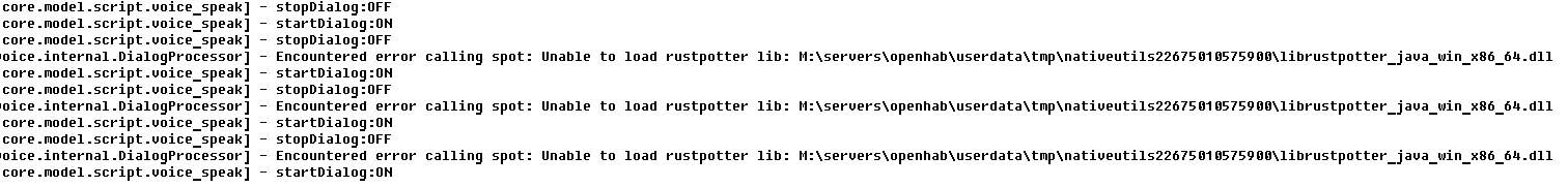 Last night, while testing the operation of startDialog when called from the rules or the OH console (openhab:vocie startdialog), I discovered that after executing stopDialog (openhab:vocie stopdialog), I get a dll loading error in the logs, and then subsequent calls to startDialog (or openhab:voice registerdailog->openhab:voice unregisterdialog->openhab:voice registerdailog) will be fail until the server is restarted.