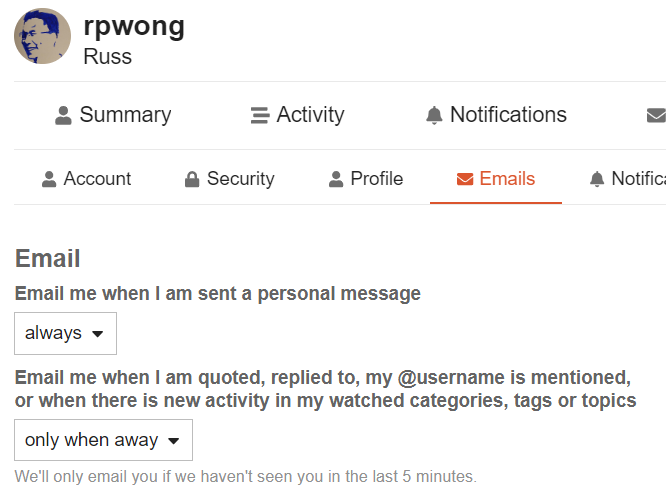 And then enabling “Email me when I am quoted, replied to, my @username is mentioned, or when there is new activity in my watched categories, tags or topics”?