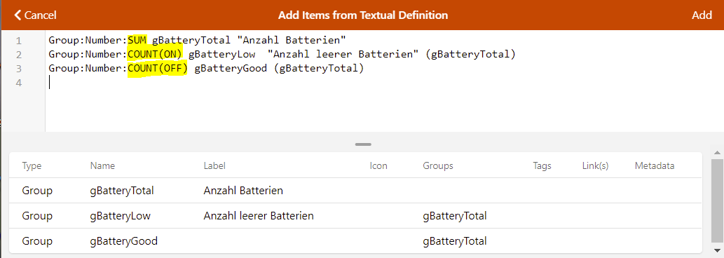 Good pointe, I know there is, but as far as I know you can’t use that with a group of Switch items (battery low is ON or OFF). Futhermore in OH3, I can’t assign the COUNT aggregation on anything.
