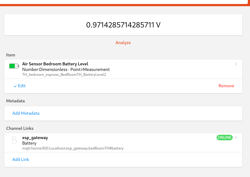 I am adding my homemade air sensors into OH3 (stable release). The battery voltage is an item linked to an mqtt channel with Voltage property - it seems to work properly as the “V” unit is added.