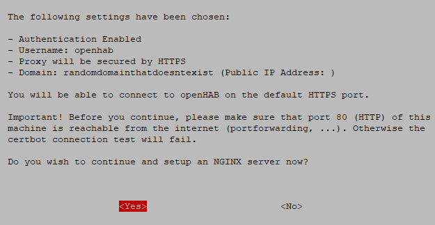 However, when trying out the setup for reverse proxy in the openhabian-config tool, the public IP address still doesn’t get obtained…