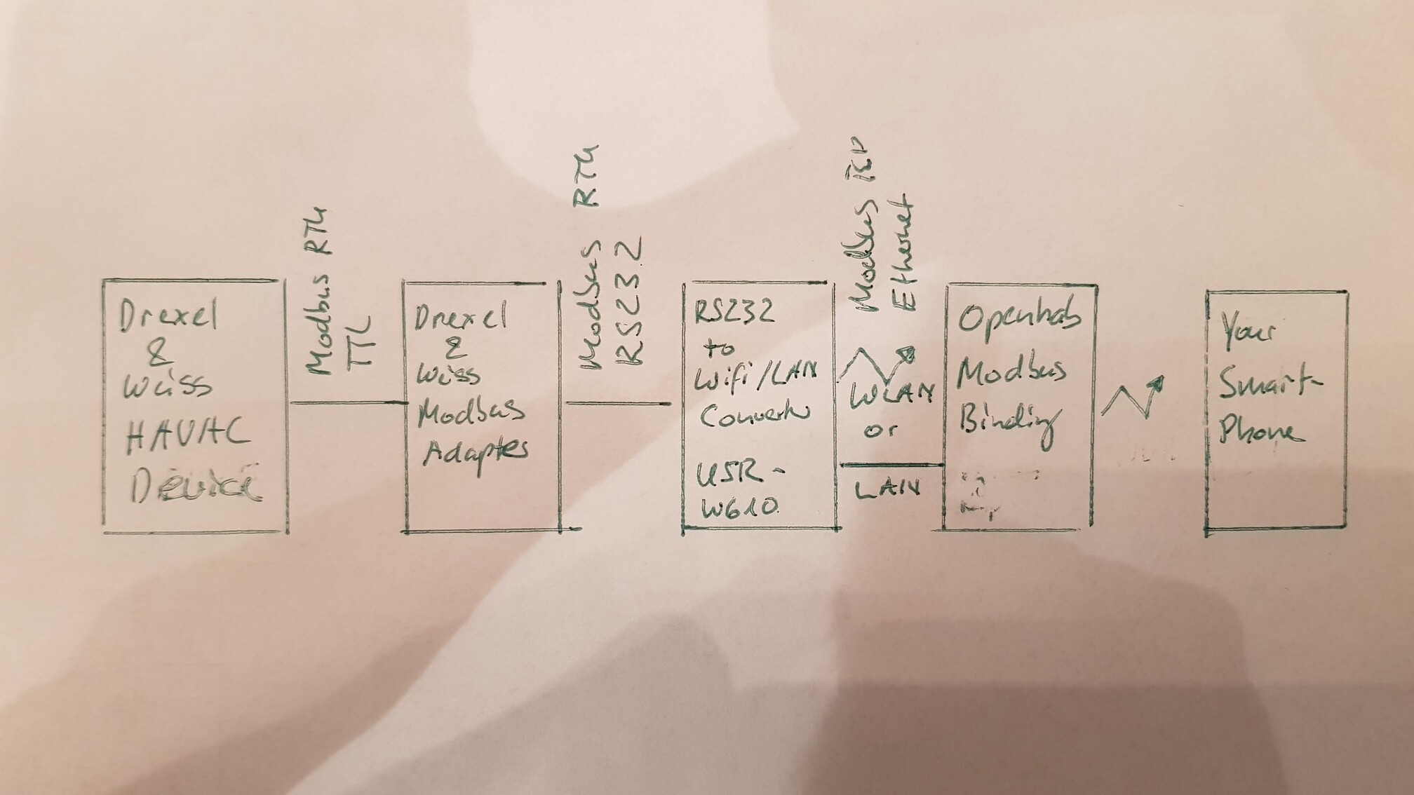 The D&W Device Modbus Signal needs first to be converted from TTL (0/5V) into RS232 (±15V). D&W offers an RS232 Adapter for this purpose. You need only the RS232 Adapter described in cpt 1 “Hardware”. Alternatively, you can also buy any TTL/RS232 Converter and build the adapter on your own, but it needs some electronics experience and special plugs. Anyone wants to know more about that, let me know. From Modbus RS232 the signal needs to be converted into Ethernet. A possible solution is the USR-W610 which has both a LAN and WLAN Interface (less than 30€ at AliExpress). The Modbus Binding makes the connection into Openhab.