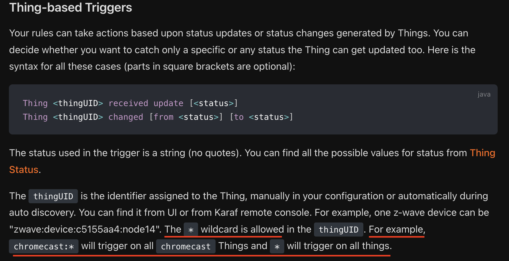 I try to trigger a rule with a thing status change, i.e. the thing goes online or offline.