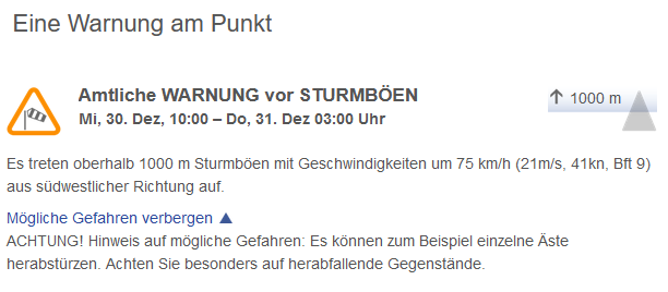 I had to wait several weeks, until today. Now there is a warning “Sturmböen” and it is available for my city.