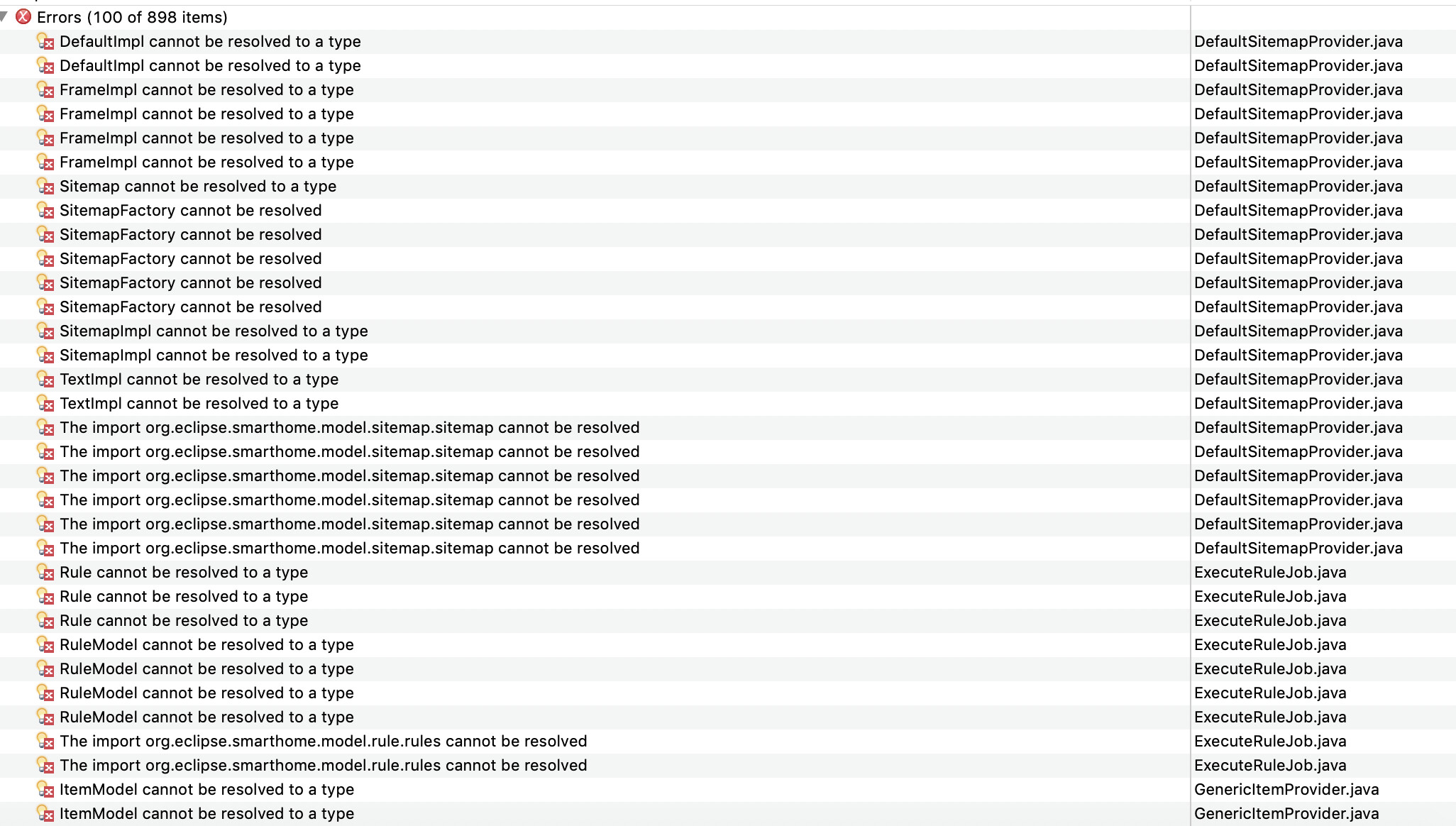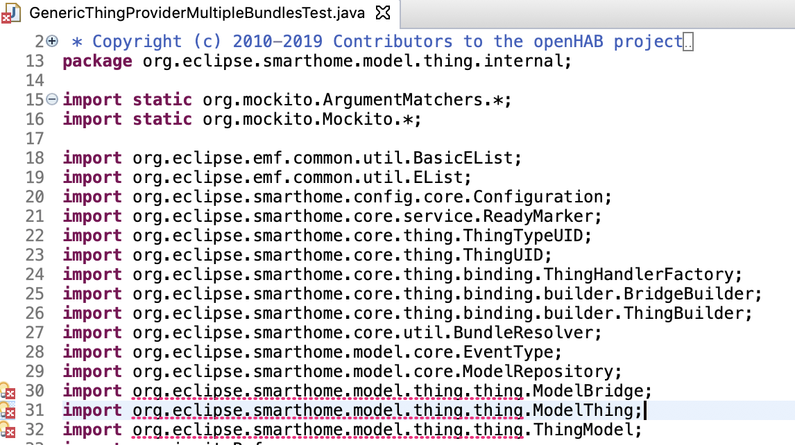 Hi all, I followed the instructions here https://www.openhab.org/docs/developer/ide/eclipse.html to configure my eclipse IDE. I imported all openHAB working set except for Zigbee and ZWave binding. However after it finishes building automatically, many errors come out and here is the screenshot. Notice that here I only open openhab-core and Infrasturce, and leave OH2 addons and Web UIs close.