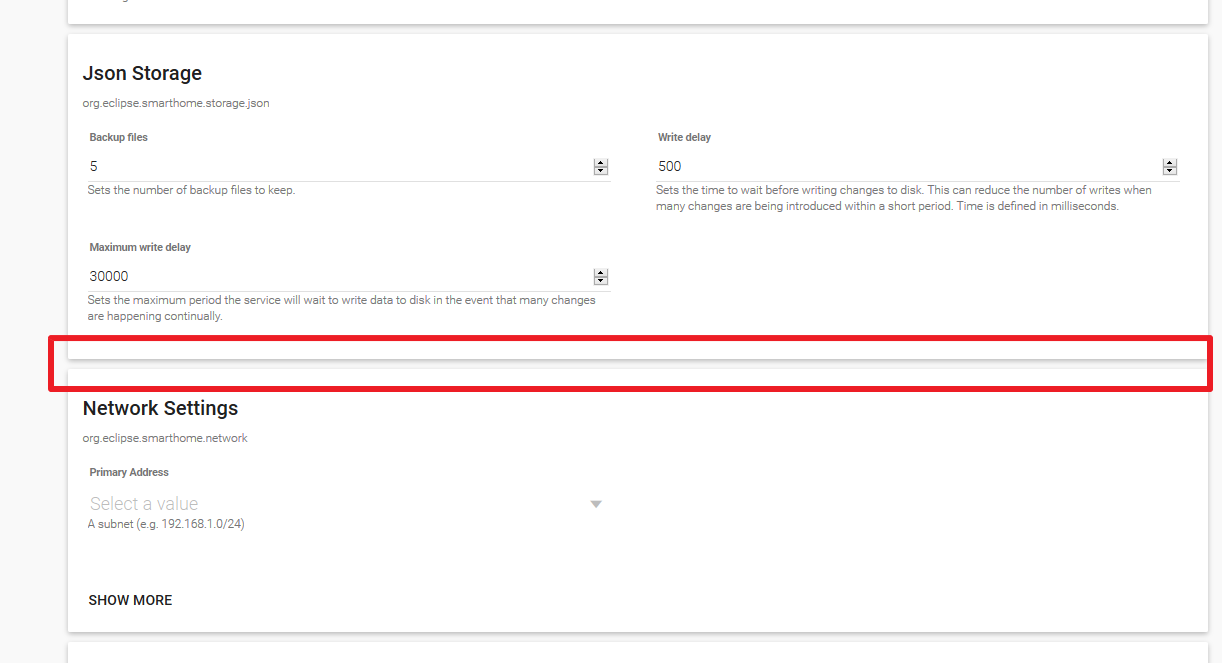 However it does not appear anymore in Karaf Console bundle list and the configuration section in PaperUI is also missing. In 1583, I could find configuration options in PaperUI in Configuration–>System between ‘Json Storage’ and ‘Network’: