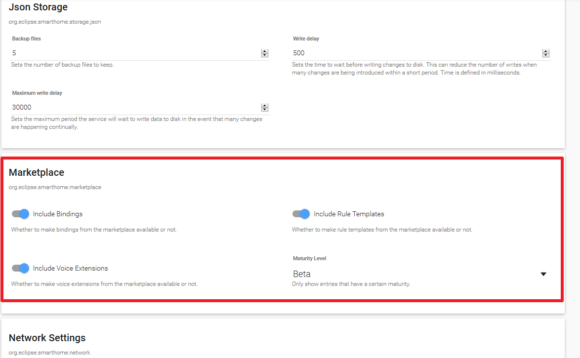 I just tried a fresh intall with OH2.5 Snapshot 1590. I need some bindings from the Eclipse IOT marketplace so I installed it as Addon. Now I would like to configure the settings for the Eclipse IOT marketplace (I want to set Binding Maturity Level setting to Alpha). In former snapshot versions there was a section available in PaperUI in Configuration–>System. It seems to have disappeared? Whre can I find it now and how can I install “alpha level” bindings from Eclipse IOT marketplace now with 1590?