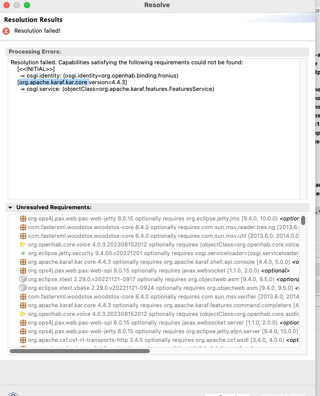 I have setup a Eclipse IDE using the Eclipse Installer and switched to the 4.0.x branch afterwards for distro and addons. Basic demo application launches, but as soon as I add a binding like org.openhab.binding.fronius to it, it won’t resolve, with the following message popping up