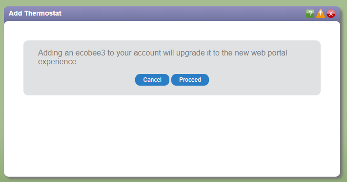 This switches to the new portal, press X on the ADD THERMOSTAT panel, and then I get the new portal. If I log out and back in. I’m back to the old portal.