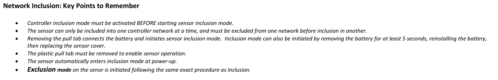 To restore this sensor to factory default settings, follow the instructions for product exclusion which will reset the sensor upon completion of the process. Use this procedure only in the event that the network primary controller is missing or otherwise inoperable