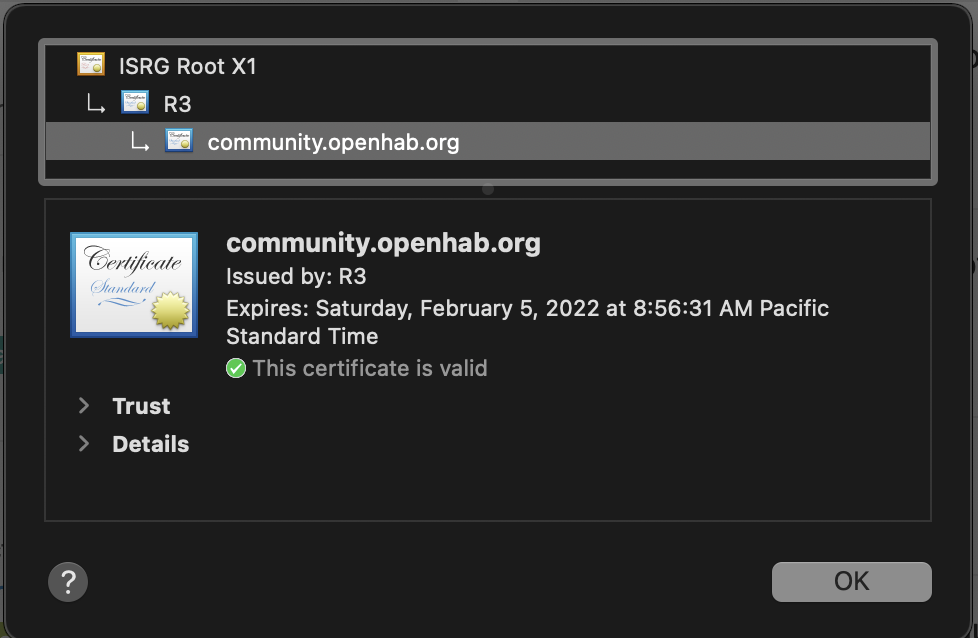 On https://community.openhab.org/ we use let’s encrypt and the certificate looks alright to me: