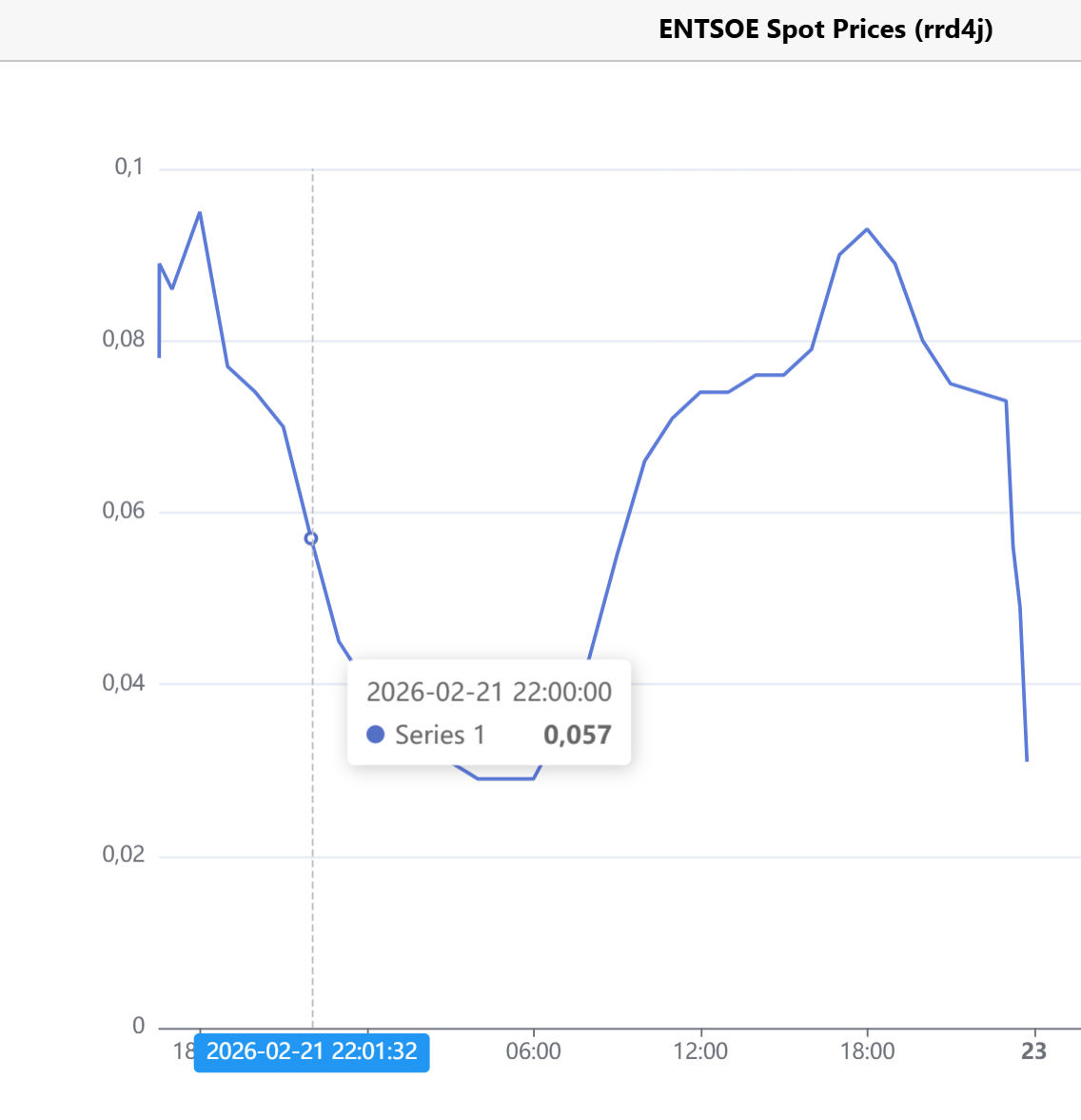 @ weymann, I think there is a small glitch in the calculation of hourly prices at 23-24. For example, the price at 23-24 today is 7.64c/kWh in Finland (this includes the VAT and commission of the electricity provider) and Entsoe gives a value of 6.077c/kWh. I think the bug is in the calculation of the average value.
