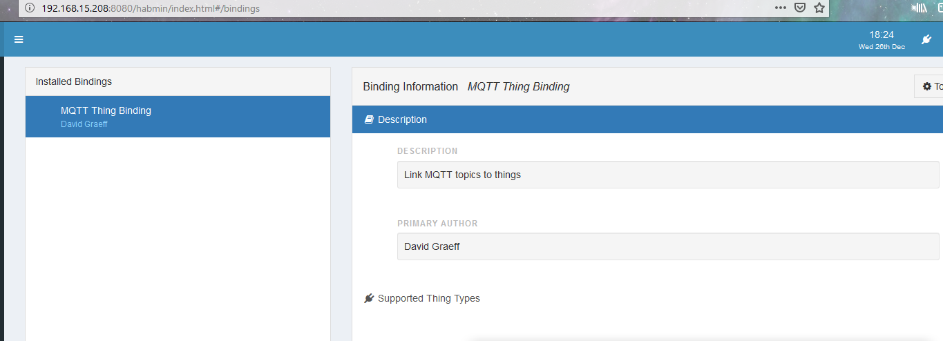 - Issue of the topic: I can´t connect my site map with MQTT, i already have install mosquito and that is working fine, in the past for the configuration of the mqtt binding i change this line: <broker>.url=tcp://<host>:1883 to this: broker.url=tcp://raspIP:1883 in this file: /etc/openhab2/services/mqtt.cfg but in this new version this file isn´t exist.