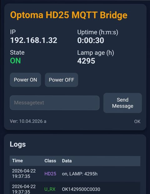 The MicroPython script enables to connect an Optoma Projector with RS232 interface to a smarthome by MQTT messages. So far it transmits power ON and OFF command and can make use of the text notification option. It polls the status and current lamp age.