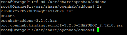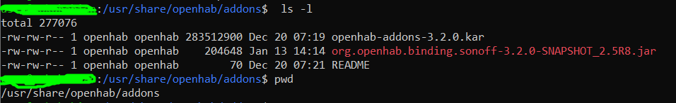 I tried to install this binding, with a βwget openhab-sonoff-compiled/org.openhab.binding.sonoff-3.2.0-SNAPSHOT_2.5R10.jar at main Β· delid4ve/openhab-sonoff-compiled Β· GitHubβ in the folder " /usr/share/openhab/addons". As mentioned in the topics.