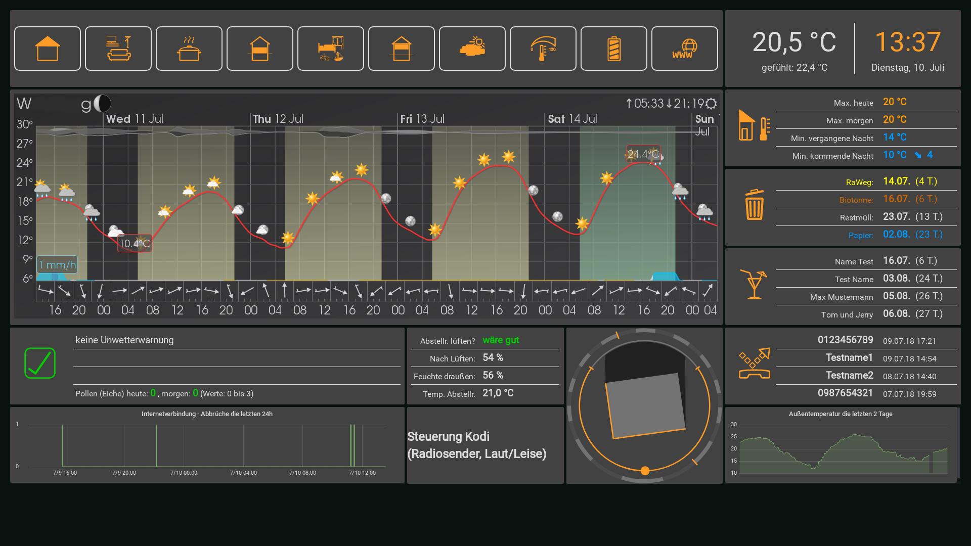 The 2 graphs are only for testing - the one in the lower rigth corner will be replaced by a graph showing used and generated power, the graph on the left side will be replaced by “knx-scenes” or important buttons for the living room.