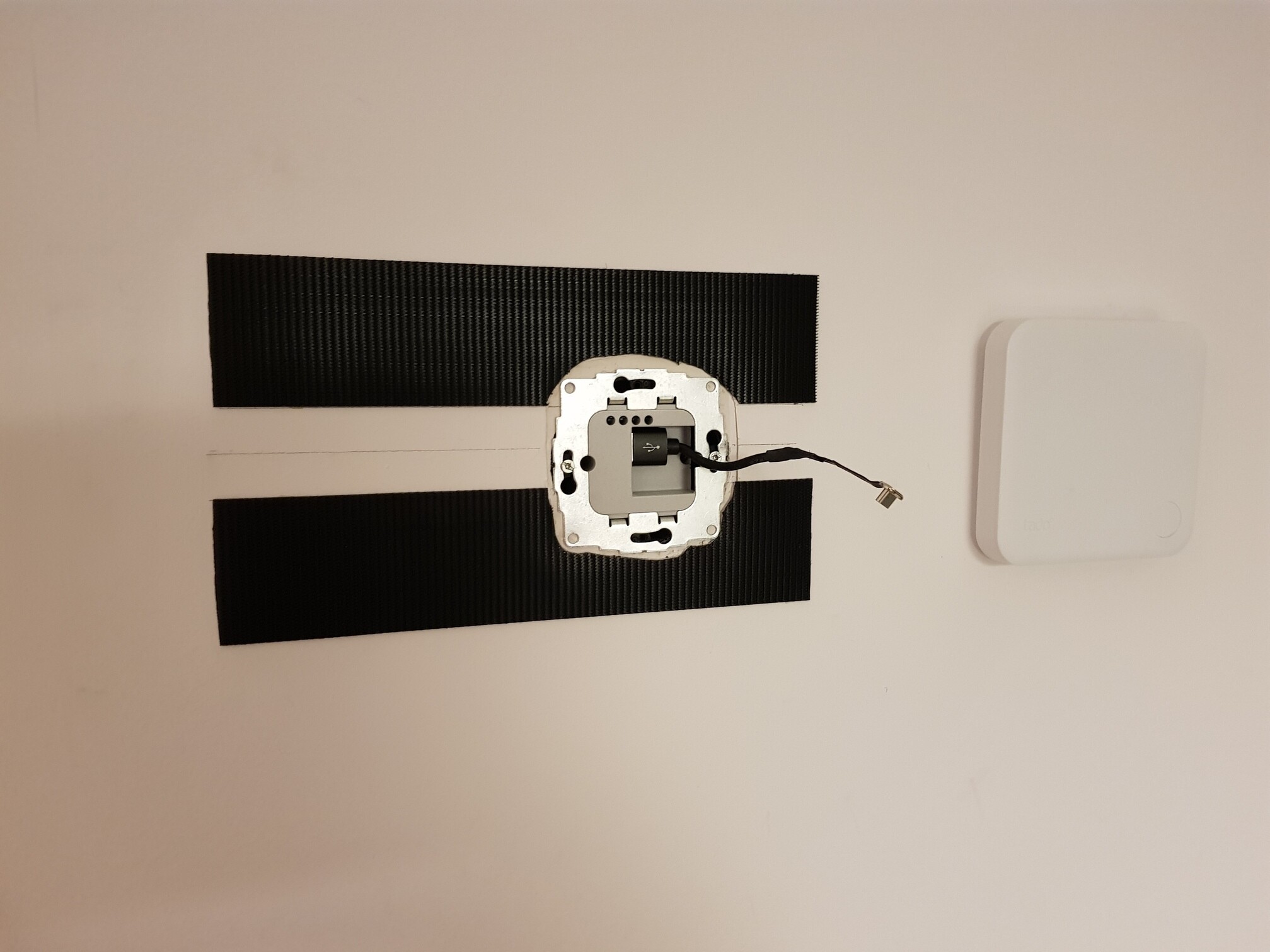 The tablet is flush in the wall. I then put a picture frame through the table saw to make it the right thickness. I used a recessed wall plug behind the tablet.
