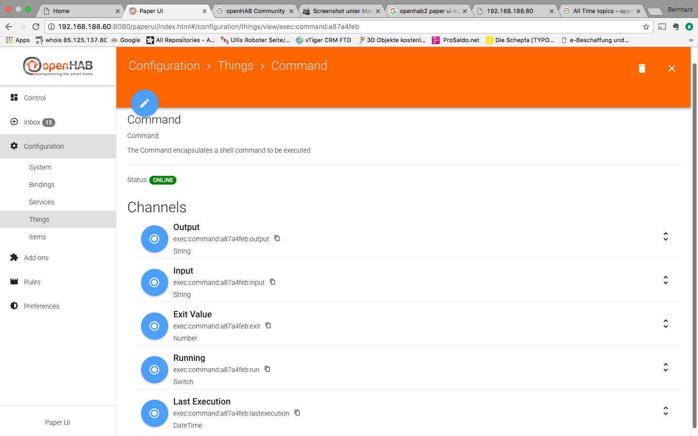 Bind an item to the output channel of your thing and log the returned information of the execution.