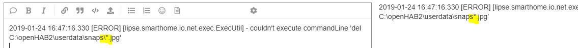 2019-01-24 15:30:19.852 [ERROR] [lipse.smarthome.io.net.exec.ExecUtil] - couldn’t execute commandLine ‘del C:\openHAB2\userdata\snaps*.jpg’