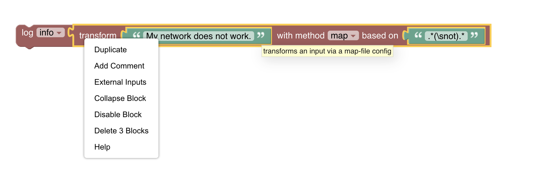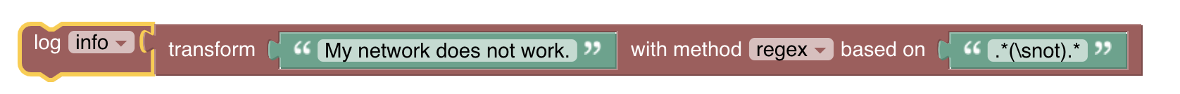 logger.info(transformation.transform('REGEX', '.*(\\snot).*', 'My network does not work.'));