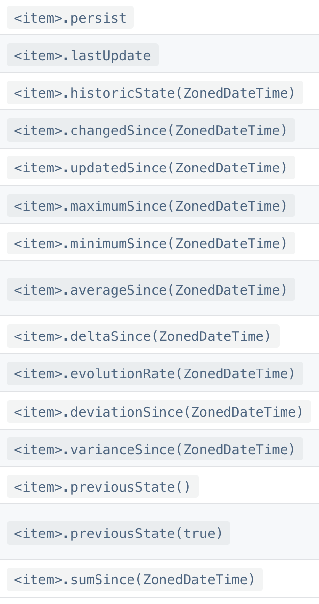 Looking at the code it reveals the minimumSince and maximumSince actually should a HistoricItem which itself has a timestamp, the currentState and the item’s name. It is strange that the maximum returns a reference and the minimum a string representation even though it is of the same type.